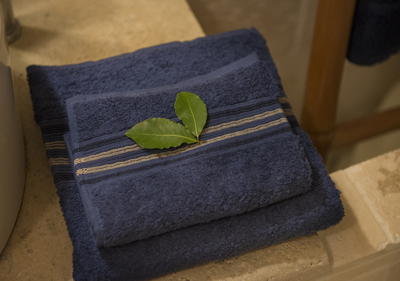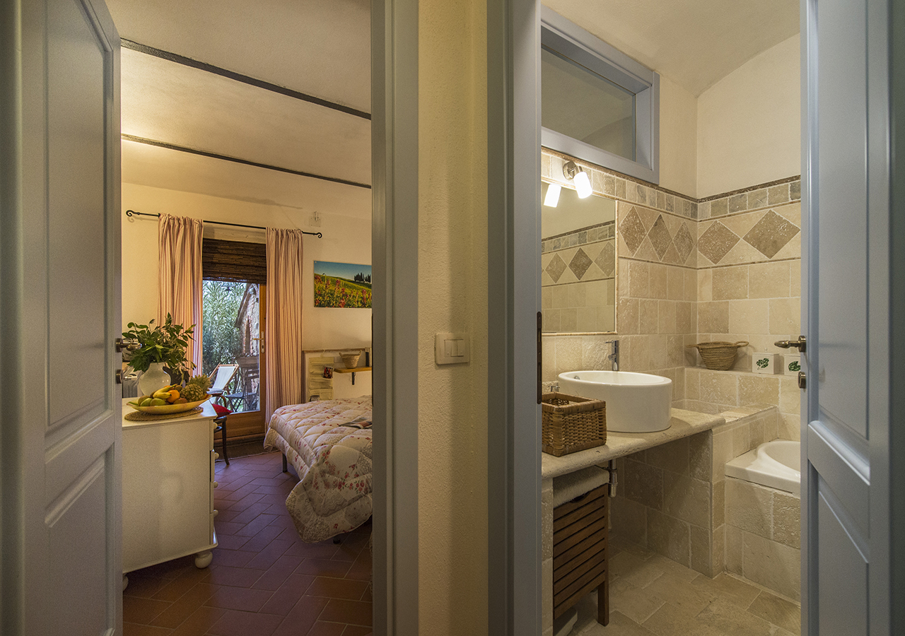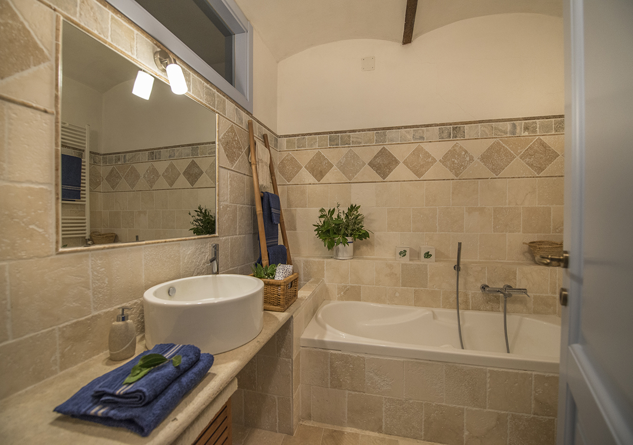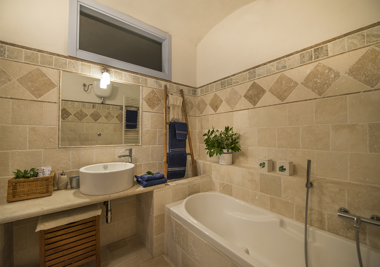 adiacente alla stanza è presente il bagno in travertino con vasca da bagno.