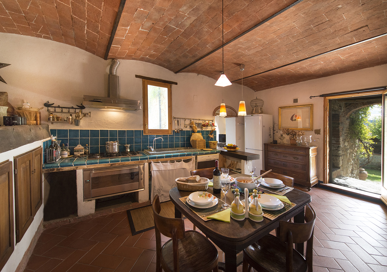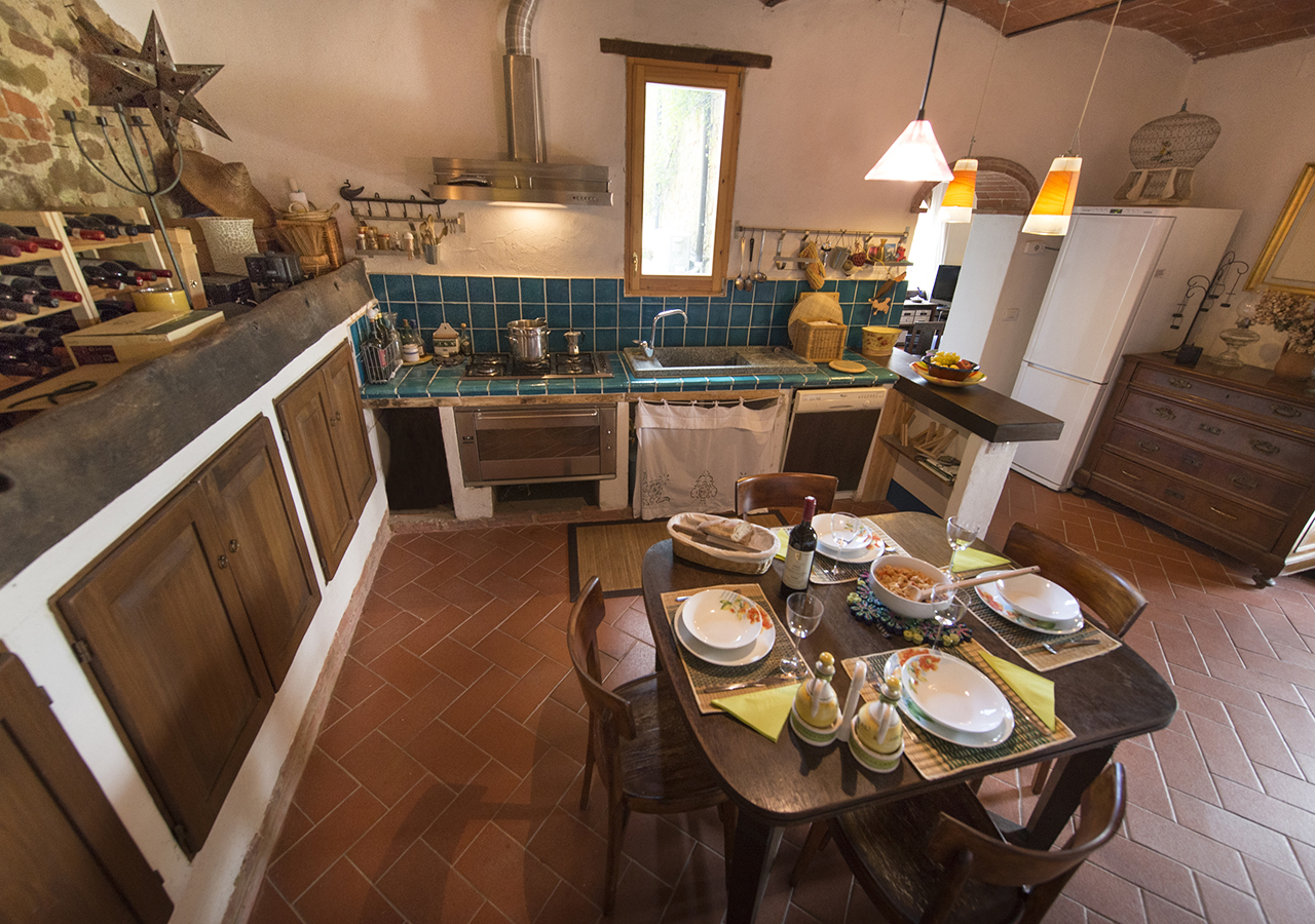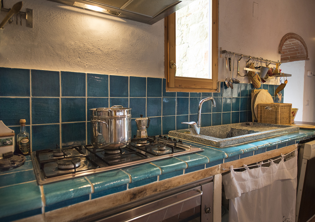 La cucina è grande circa 20 mq, è completamente attrezzata e finemente curata, le volte e le piastrelle fatte a mano colore blu caratterizzano l’ambiente, sono presenti forno micro onde, lavastoviglie e tutti gli accessori per cucinare.