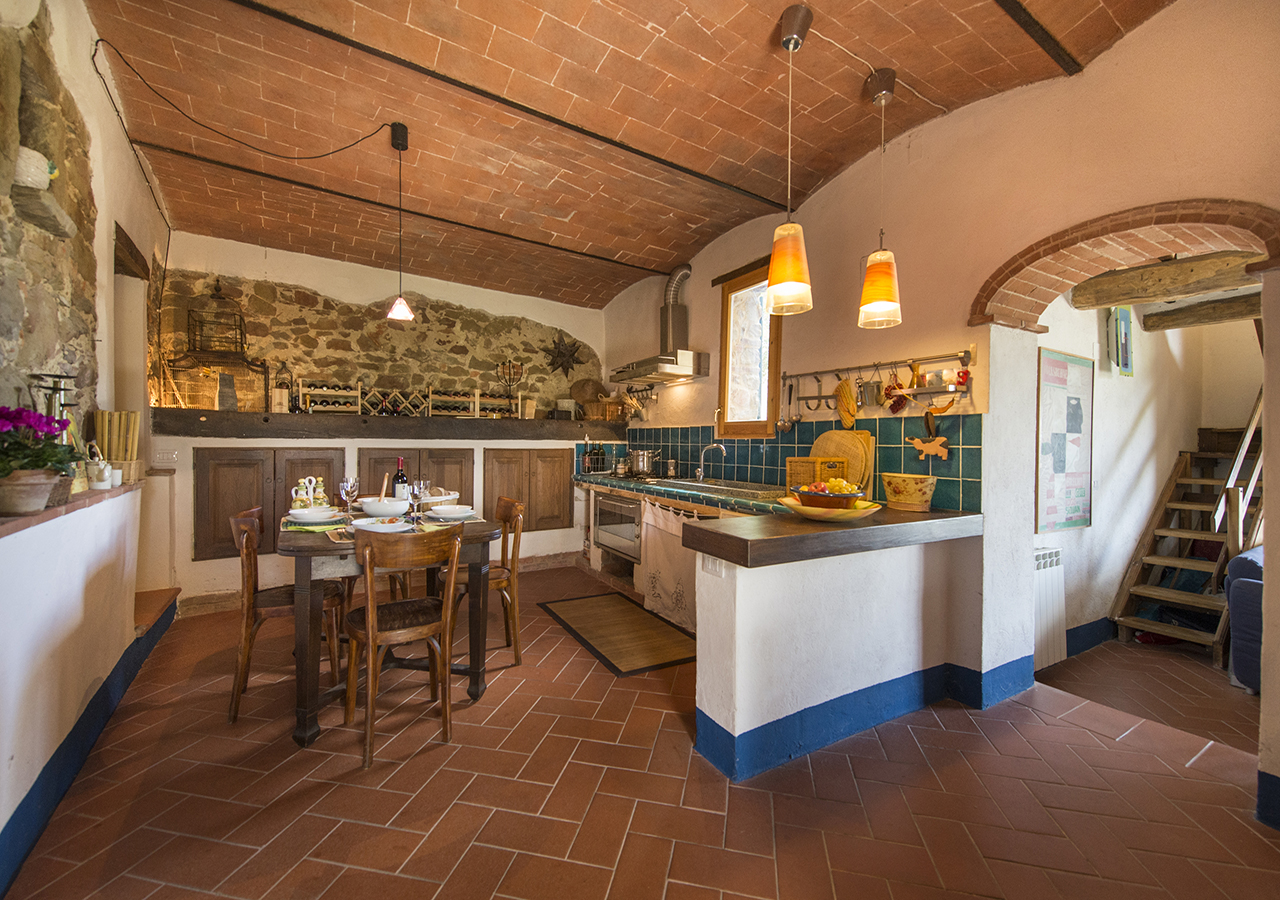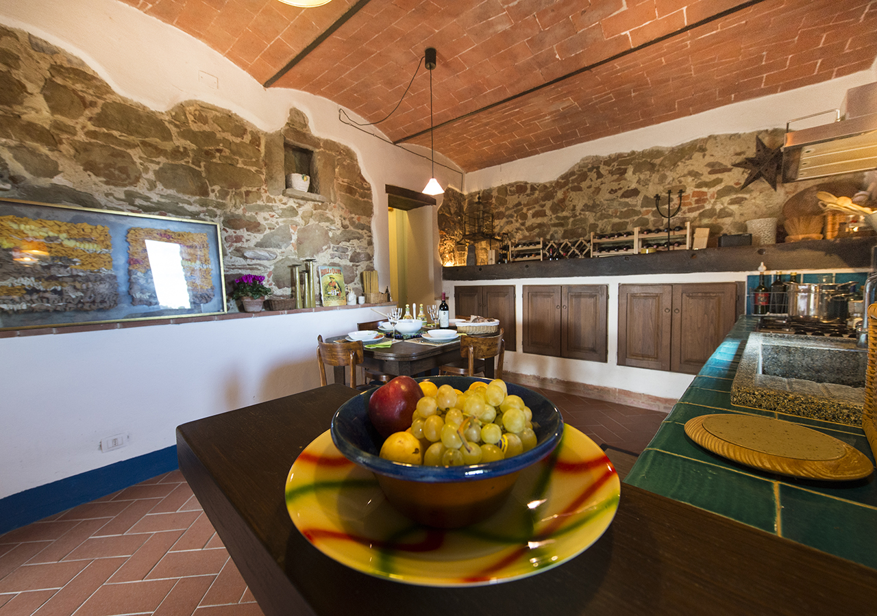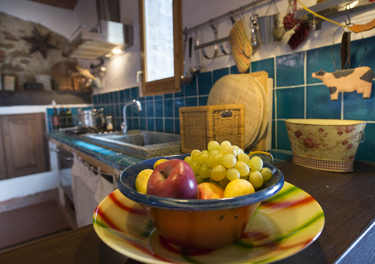 La cucina è grande circa 20 mq, è completamente attrezzata e finemente curata, le volte e le piastrelle fatte a mano colore blu caratterizzano l’ambiente, sono presenti forno micro onde, lavastoviglie e tutti gli accessori per cucinare.