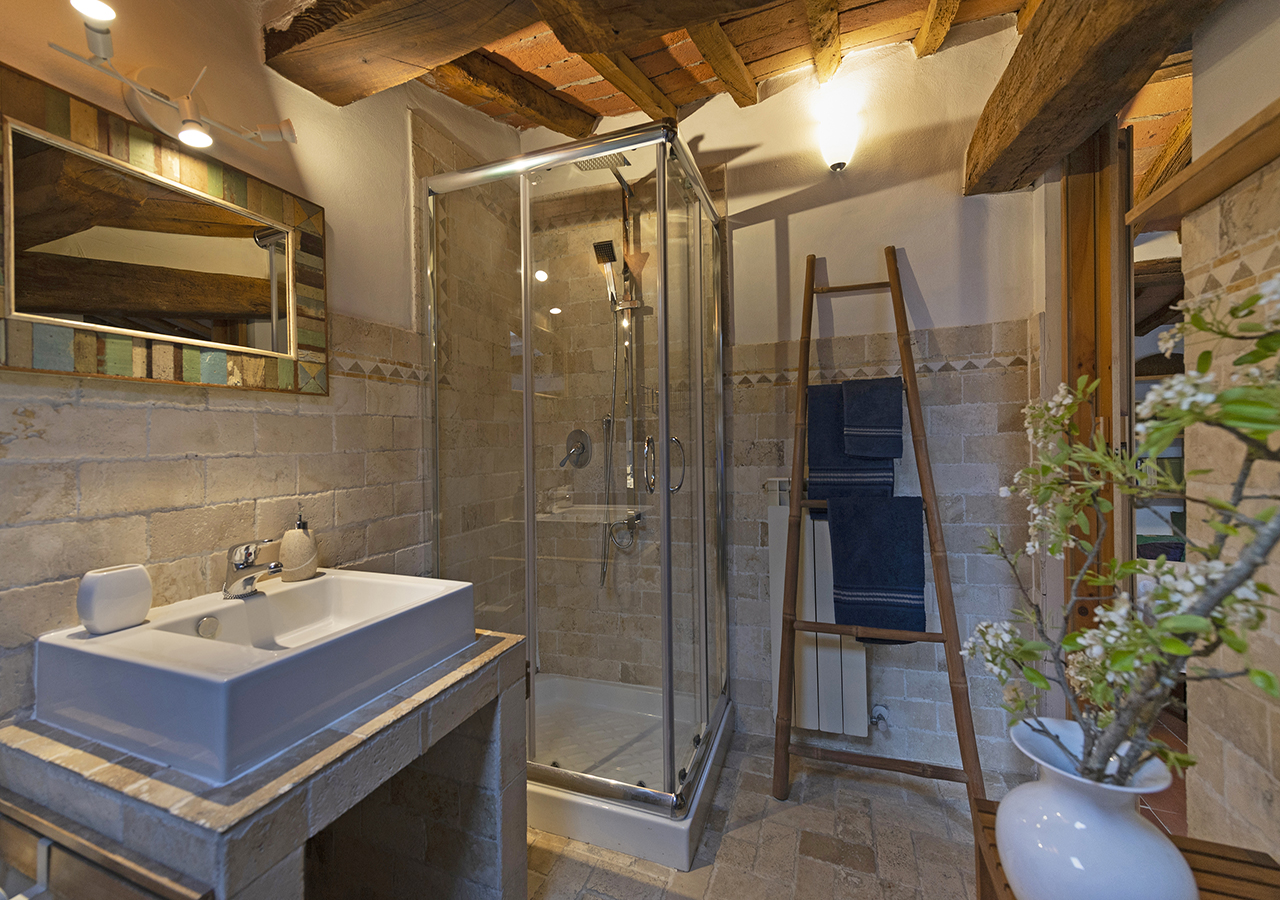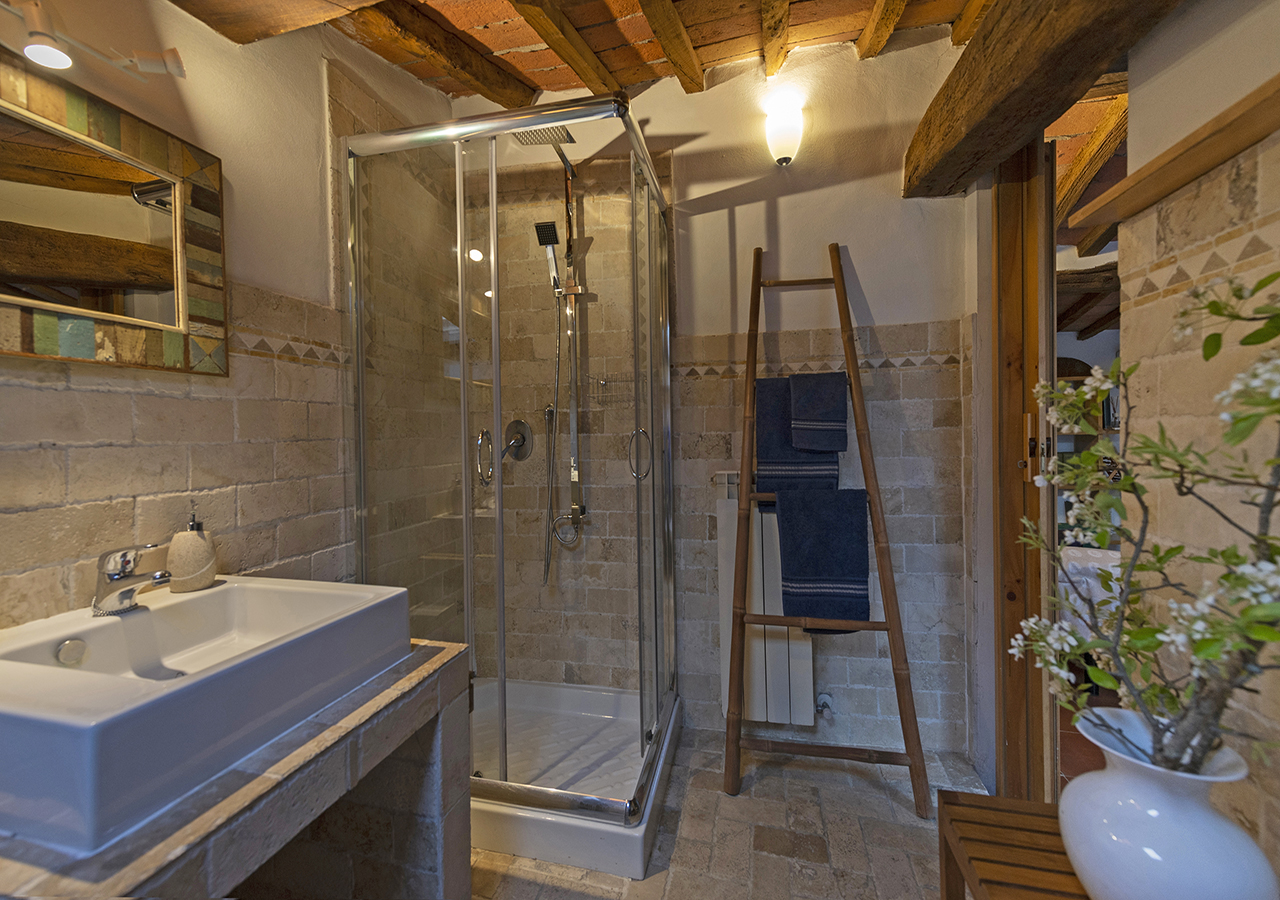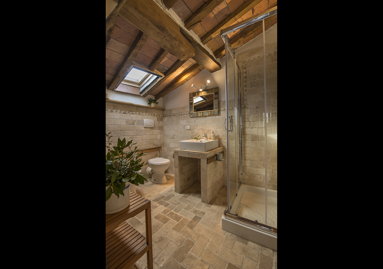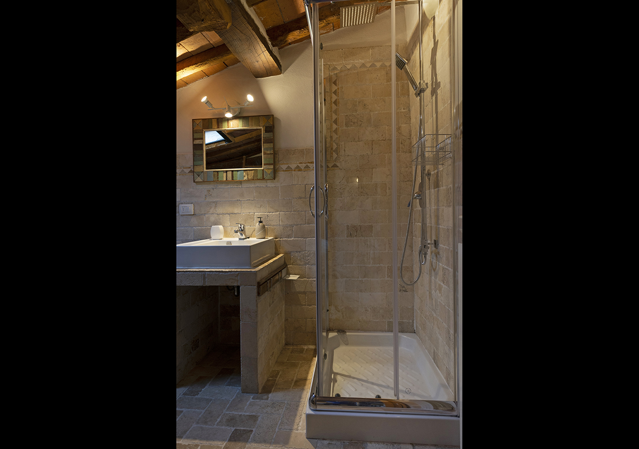 adiacente alla stanza è presente il bagno in travertino con box doccia.